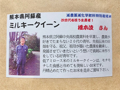 阿蘇中央高校農業科出身の20代農家が、祖父母から受け継いだ田畑で真心込めて育てたミルキークイーン。